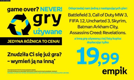 Od dzisiaj w 180 salonach sieci Empik na terenie całej Polski można sprzedawać i kupować używane gry w wersjach na konsole Xbox 360 oraz PlayStation 3. Dodatkowo firma przygotowała specjalną promocję dla graczy, dzięki której największe hity ubiegłego roku, jakBattlefield 3 czy Batman: Arkham City, można wymienić na inne bestselery, dopłacając jedynie 19,99 zł.